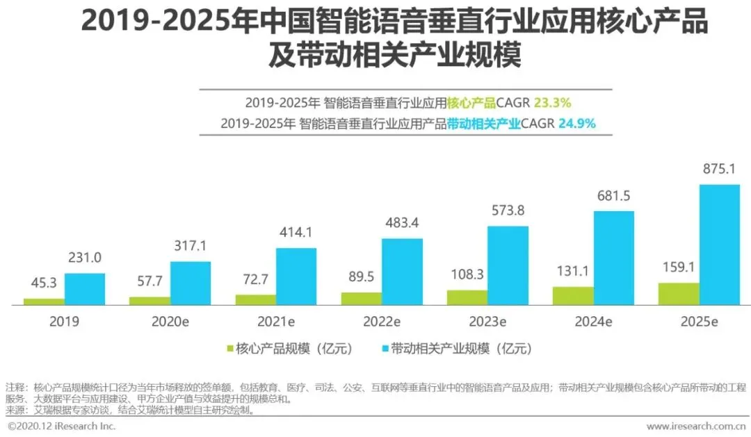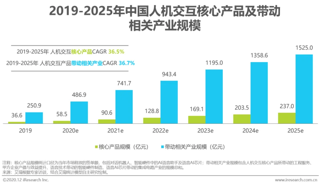 语音交互技术正在逐步改变人们的生产及生活方式。人机交互产品通过将用户意图转化为机器可以理解的内容,可协助用户解答问题或帮助用户完成特定任务。其中,对话机器人为客服等服务性行业带来了产品改革及效率优化;而基于AI语音助手的对话交互功能则促进了一系列消费级智能硬件产品的出现或升级,如智能音箱、智能车载、语音控制家电等。据艾瑞测算,2020年我国对话式人机交互产品的市场规模达到58.5亿元,带动相关产业经济规模达486.9亿元。除典型的对话式人机交互产品外,2020年智能语音技术在教育、医疗、司法、公安、互联网等垂直行业应用的核心产品规模达到57.7亿元,带动相关产业经济规模达317.1亿元。