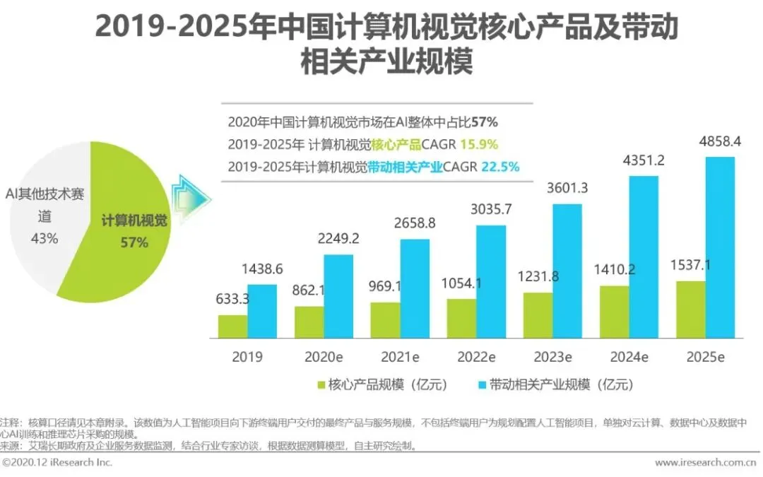 得益于深度学习算法的成熟应用,侧重于感知智能的图像分类技术在工业界逐步实现商用价值,助力金融、安防、互联网、交通、医疗、工业、政务等领域智能升级。通过对下游行业需求统计测算,2020年我国计算机视觉产品的市场规模占整个人工智能行业的57%,达到862.1亿元,与此同时,和计算机视觉有关的计算机通信设备销售、医疗器械等专用设备销售、工程建设、传统业务效益转化等带动相关产业规模超过2200亿元。