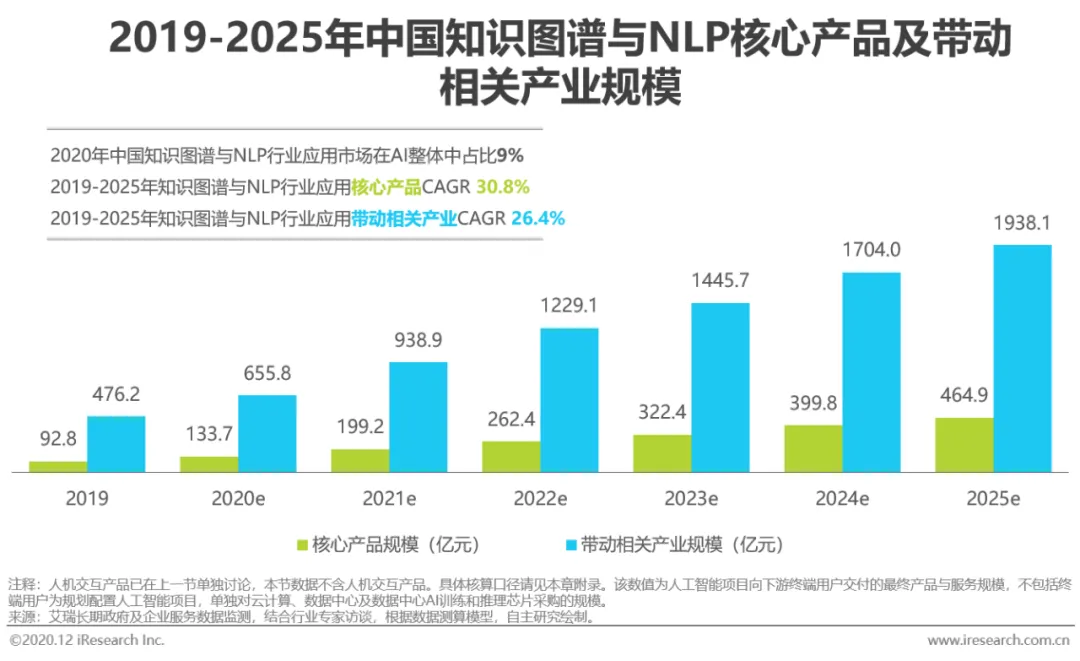 自然语言处理本质是一个文本处理+机器学习的过程,它让计算机完成以自然语言为载体的各类非结构化信息的处理任务;知识图谱建立从数据到知识库中实体、属性、关系的映射,使得机器理解与解释真实自然世界成为可能。在实际应用中,知识图谱和NLP往往有着相同的目的、紧密耦合,比如通过搜索引擎做信息检索时,既需要对自然语言进行抽取,又需要通过实体之间的联系进行推理返回结果,以使提供的信息准确、丰富、有层次、可延伸阅读。从数字世界的发展阶段而言,已经到了感知层面的信息爆炸期,注意、记忆、推理、问题求解、决策以及语言生成等认知层面能力整体而言开始被撬动,感知层面的变化将给知识图谱与NLP带来新的机遇。垂直行业的知识图谱与NLP产品先一步发展起来,在2020年将实现超过百亿元的销售规模,预计到2025年,下游客户渗透扩散,图谱构建工具和“工艺”进一步成熟、情感分析任务与多模态识别碰撞出新的产品形态,刺激市场达到近500亿元规模。