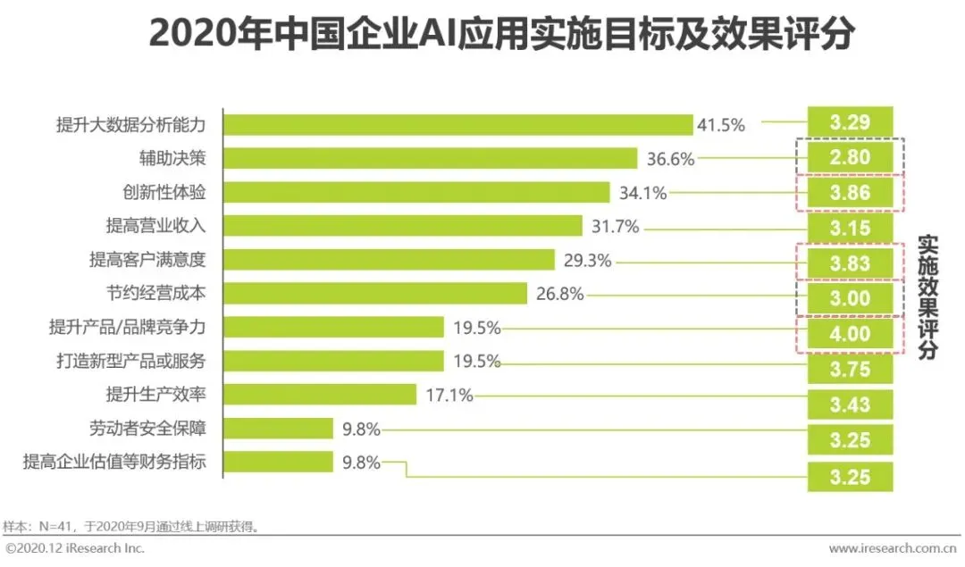 通常企业为AI项目实施设定明确的目标并以此定期评估实施成果,最常见的实施目标主要有提升大数据分析能力(41.5%)辅助决策(36.6%)、创新性体验(34.1%)以及提高营业收入(31.7%)。实施效果评估层面,以5分为满分,统计评分结果,最终提升产品/品牌竞争力、创新性体验、提高客户满意度的完成效果最佳,评分均在3.8以上;辅助决策目标的完成度最低,评分仅为2.8。