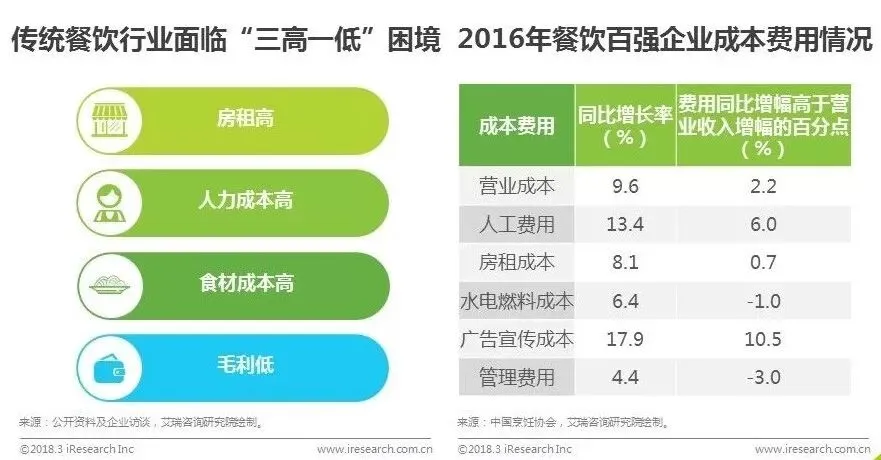 与整个行业的稳步增长不同的是,餐饮企业的经营难度越来越大。根据餐饮老板内参与美团点评联合发布的《2017年中国餐饮报告》,北上广深四大城市每个月餐饮门店的倒闭率高达10%。一个餐饮门店的寿命长则3-4年,短则几个月就已经终结,高淘汰率成为餐饮行业的常态。中国烹饪协会数据显示,2016年,全国餐饮百强企业的利润率仅4.70%,众多餐饮商家面临着房租高、人力成本高、食材成本高、毛利低的“三高一低”的困境,利润空间被不断压缩。