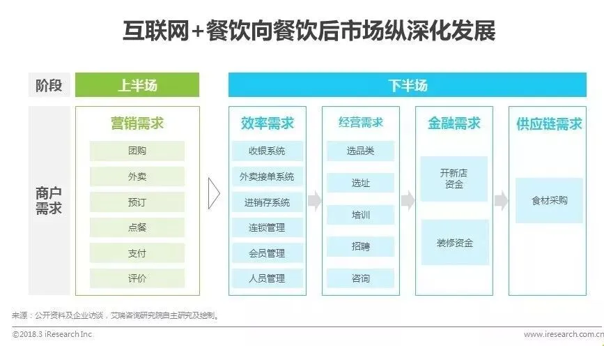 早期,互联网网餐饮平台主要实现了餐饮商家的信息和交易的线上化,通过团购、外卖、预订、评价等功能,帮助商户进行线上营销与引流。这一阶段,互联网平台依赖C端的人口红利实现了爆发式的增长,但对餐饮行业的渗透仍停留在最末端的一层。随着移动互联网时代人口红利的消失,这种发展模式的增长空间已经十分有限。平台企业纷纷转战B端,驶入更加纵深化的发展道路,满足商家从IT系统、经营、金融到供应链的全方位需求,实现从上游到下游的产业互联网化。