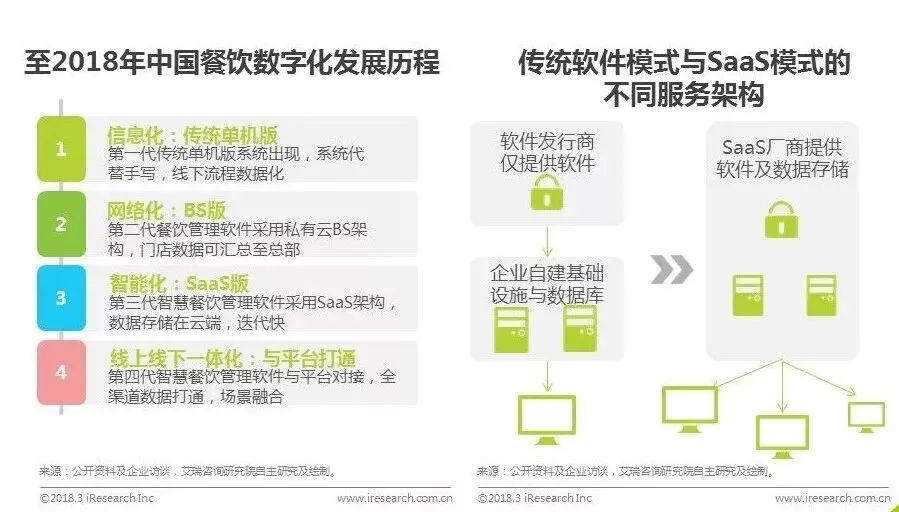 餐饮行业的数字化进程历经了4个阶段,第一个阶段有了IT系统,相对最原始的手写,提升了商家效率。第二阶段出现了BS架构的私有云,餐饮门店的数据可汇总至总部,实现连锁化管理。前两个阶段,都是基于传统软件的模式。第三阶段,餐饮软件开始智能化升级,进入SaaS时代。数据储存在云端,餐饮行业开始进入数据驱动运营的阶段。第四阶段,智慧餐饮系统开始与平台对接,第四代智慧餐饮管理软件出现,平台的线上消费场景与门店线下消费场景相融合,线上线下全渠道数据打通,餐厅真正实现实时在线。