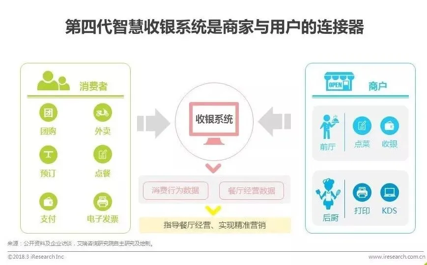 当前餐厅收银软件已不局限于收银,更是一个餐厅、平台与客人的连接器,成为智慧餐饮的入口。收银系统对接消费者从预订、点餐到支付的全渠道全流程消费行为,同时连接餐厅前厅后厨及供应链系统,简化餐厅服务流程,提高效率。大数据环境下,智能支付所形成的场景连接可以有效带动餐饮行业实现效率升级,而系统中沉淀的用户消费行为数据与餐厅经营数据又可以作用于餐厅营销、改善服务和打造餐饮品牌。