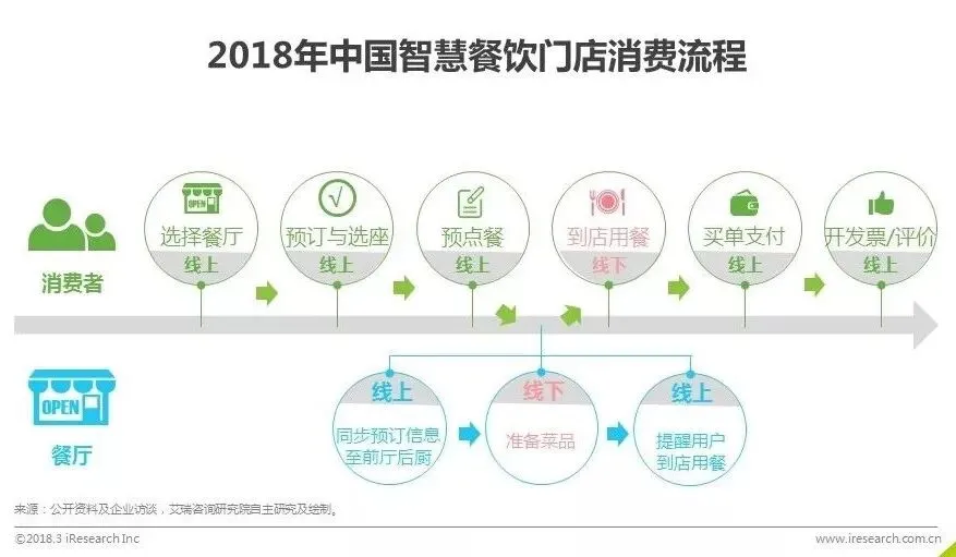 餐饮消费时间段相对集中,高峰期的排队不但降低了就餐体验,同时也降低了餐厅出品的效率。智慧餐饮的应用,让消费者“来了就吃,吃完就走”成为可能。以看电影为例,过去大家都要到现场去买票,甚至排队。在线票务平台出现以后,用户就可以直接在手机上买好票、选好座,看电影的选择成本和消费成本大幅降低,反过来也让更多的消费者愿意去电影院看电影。同样类比到餐饮行业,消费者通过互联网平台可以看到餐厅的实时菜品与座位,就餐前在平台进行预订、选座,并提前点好餐、付完款、甚至开好发票。商家根据消费者的预订信息,在消费者到店前提前准备好菜品并提醒就餐。消费者除了就餐外的所有环节均可以在线上完成,就餐的便捷程度与体验均大大提升。