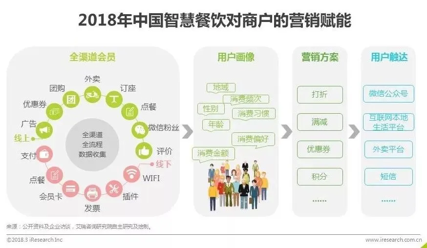 智慧餐饮服务改变了会员对于餐厅的价值。以往,餐厅会员业务仅是餐厅为用户提供储值功能或打折促销的手段,会员数量少且难以触达。移动互联网的发展让对消费行为的数据收集变成了可能。线上线下全渠道的消费者都将成为餐厅的会员,通过对这些会员的消费行为进行分析形成用户画像,商家可以一目了然的知道用户的消费频次、消费场景、消费金额、消费习惯等,再通过智慧餐厅服务提供的营销工具,实现用户的精准触达,吸引更多的消费者。