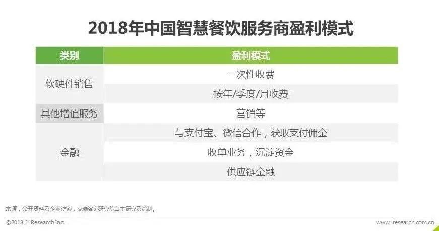 目前来看,软硬件销售是智慧餐饮服务商的主要收入来源。尽管各家企业都希望通过SaaS模式向商户按月收费,但受限于商户的付费意愿与激烈的市场竞争环境,仍有相当一部分企业仍采用的是一次性收费的模式。甚至有些企业为了迅速做大用户量,占领市场,采用产品完全免费或基础功能免费等形式进行推广。产品之外,一些品牌开始探索金融有关业务,但目前来看仍存在较大的风险或困难:1.支付宝、微信的交易佣金过度依赖支付宝及微信平台的政策;2. 没有牌照的企业收单业务存在较大的政策风险;3.供应链金融方面,餐饮服务商线下数据的积累还不够,银行等金融机构针对餐饮行业目前也没有特别成熟的产品,未来是否有足够大的发展空间还有待进一步探讨。