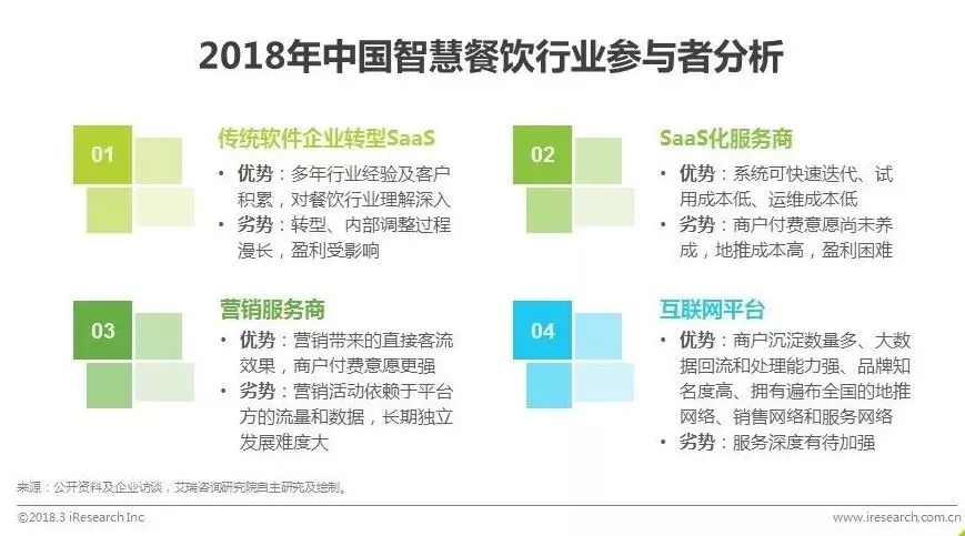 随着近些年人们对“云”的认知不断提升,餐饮SaaS越来越受到商户的接受和认可,从2014年开始,一大批参与者涌入智慧餐饮行业,全国服务商多达上千家。根据这些企业的背景与服务大致可将其分为四类:传统软件企业转型、SaaS化服务商、营销服务商以及互联网平台。不同参与者在资源、模式、产品等方面各有优劣。当前,智慧餐饮行业已逐步进入加速兼并整合的时期,一些企业开始通过兼并整合以实现优势互补:2016年神州商龙收购苏州志杰、哗啦啦与饮食通合并,2017年口碑控股辰森世纪。随着越来越多巨头的加入、行业领先者进一步扩张,行业集中度有望进一步集中。