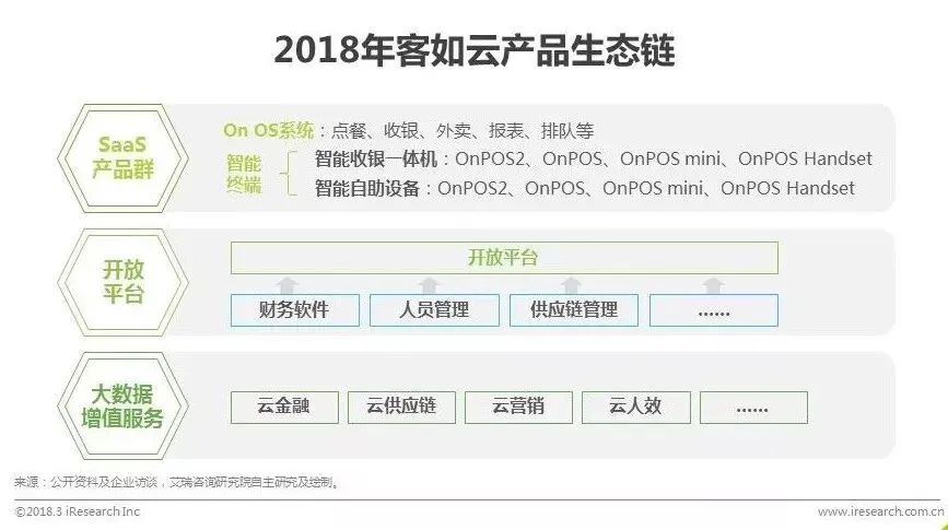 产品:客如云通过软硬一体、云端结合的SaaS模式打造了涵盖提升效率的SaaS产品群、整合餐饮上下游资源的开放平台、大数据增值服务共计三个层次的产品生态链。