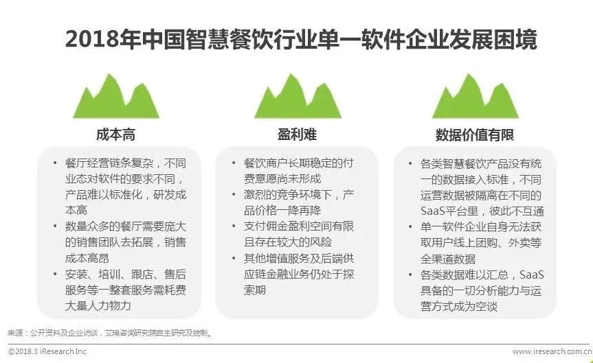 如今,众多参与者入局,智慧餐饮行业的竞争已经十分激烈。目前来看,单一的软件服务商发展仍困难重重。SaaS服务按月收费的模式目前还难以被众多中小餐厅老板接受,维持庞大的地推团队持续需要资金,更是长期的负担。很多企业声称可以通过增值服务、数据服务等方式获得收入,但事实上单一软件厂商能够沉淀的数据维度有限,通过此类增值服务要实现企业的长期运营发展路径艰难。