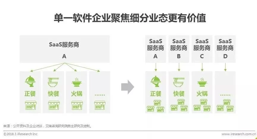餐饮业本身是个很复杂的行业,不同业态之间差异很大。当前,整个智慧餐饮行业极其分散,众多服务商覆盖的商户数量并不多,单一软件服务商服务全业态的时候,每个业态沉淀的商户数据都很少,这样就无法形成有效的规模数据分析,价值不大。对于单一软件的SaaS服务商来说,专注于业态的细分才是最好的机会,比如只做快餐行业的SaaS或者只做火锅行业的SaaS,甚至只做烘焙或者水吧的SaaS。单一软件服务商服务单业态之后,积累的数据会因为更细分和集中而更有效,这样餐饮服务商的话语权也随之加大,数据驱动的更多增值服务也有了实施的可能。