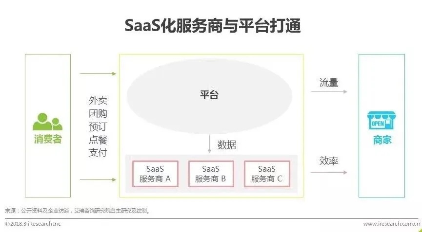 以票务平台为例,影院系统发展多年仍只能解决影院内部的问题,却无法与用户产生连接。票务平台的诞生激活了为影院提供SaaS的服务商,随时随地在手机上订票、选座成为现实,给消费者带来方便的同时也给经营者带来了实实在在的客流,消费者愿意为更便捷的服务支付一定的费用,商家也愿意为更大的客流量支付费用。类比到餐饮行业,单一软件厂商的发展困难重重,餐厅与消费者的直接连接仍需由平台完成,SaaS化服务商与平台打通方能为商家提供更有价值的服务,从流量、数据等多方面获得协同效应。