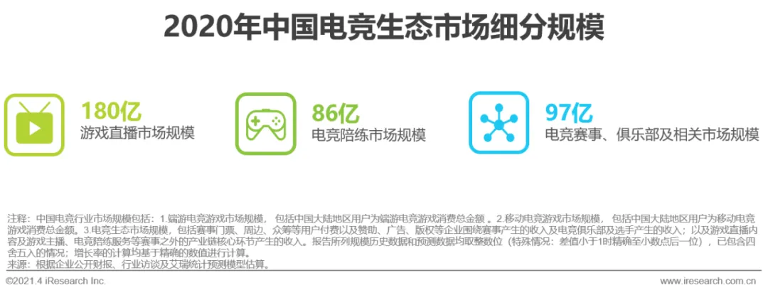 头部电竞游戏及赛事的影响力持续提升和商业化发展进程不断加速,带动了电竞产业链下游的游戏直播、电竞陪练、电竞衍生等业态的快速发展。预计在2021年电竞生态将占据28.3%的电竞市场份额,2021年电竞生态市场中的游戏直播市场规模将超过240亿元,电竞陪练市场规模将超过140亿元,电竞赛事、俱乐部及相关市场规模将超过120亿元。
