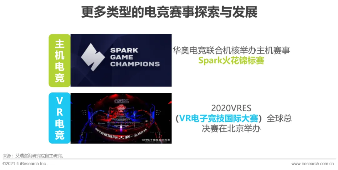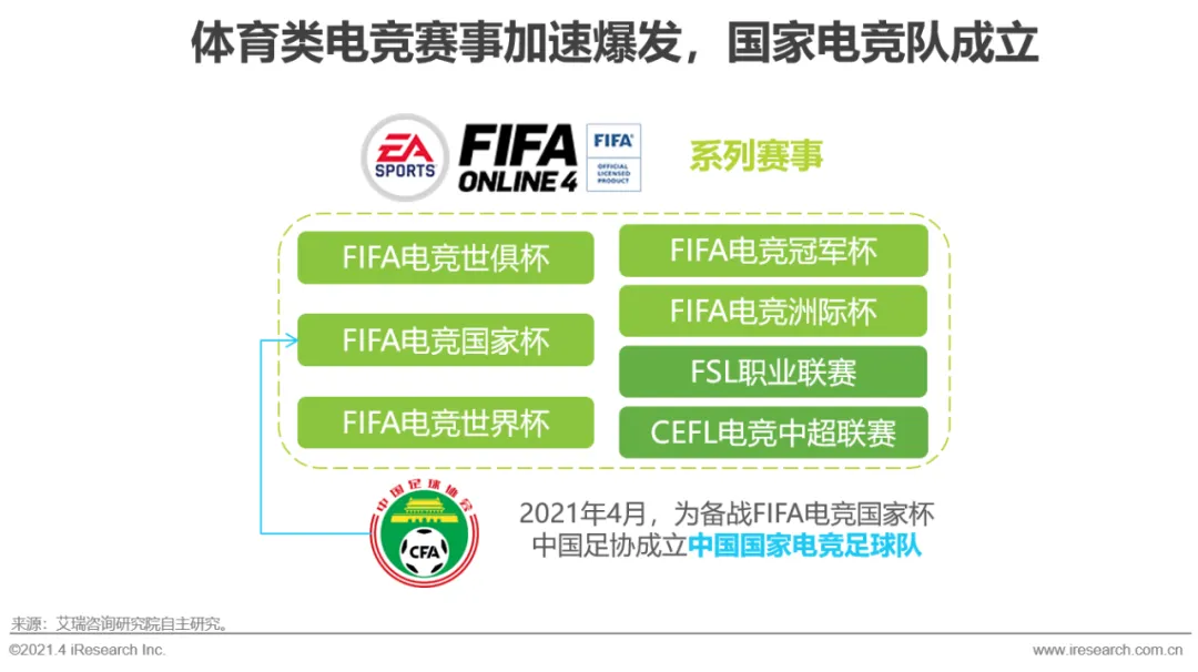 从电竞赛事的品类来看,在MOBA类和战术竞技/射击类赛事引领行业发展的同时,更多类型的电竞赛事也在快速发展。其中,体育类电竞赛事在2020年以来也广受关注,以FIFA电竞赛事为例,除了国内的FSL职业联赛及CEFL中超职业联赛外,国际性赛事的发展使得中国足协开启国家队招募。中国国家电竞足球队及上海电竞集训队的招募与成立,都标志着未来电竞国家及地方队将越来越常态化。此外,主机、VR等相关电竞赛事的成长,将助力电竞赛事生态愈加多元化。