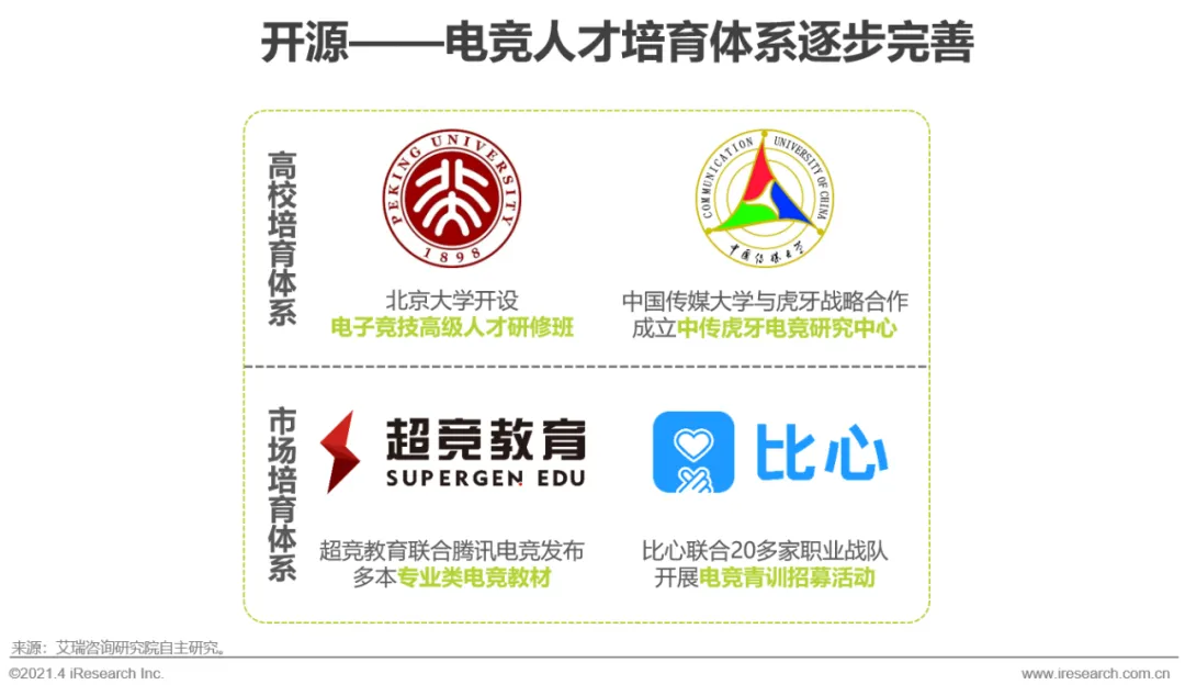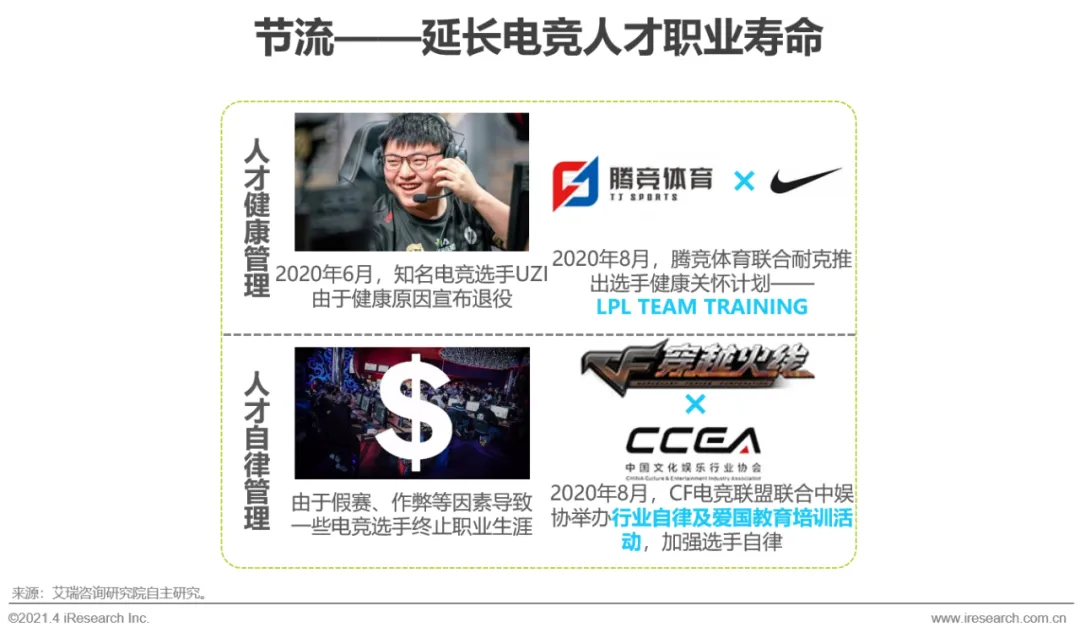 与电竞产业的快速发展不匹配的是,电竞人才仍是十分稀缺的资源。在培育优质电竞人才上,高校培育体系和市场培育体系都是产业链各方合力的成果,两者共同为电竞市场发掘和培养优秀人才。在延长电竞人才职业寿命上,头部的职业电竞赛事联盟如LPL、CF联盟等,通过推出选手健康关怀计划、举办行业自律活动,让更多的电竞选手减轻身体、心理等因素对职业生涯的影响。