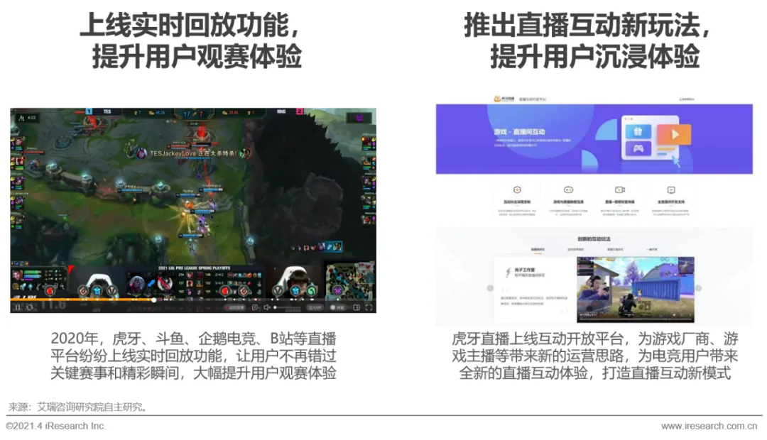 游戏直播平台作为电竞游戏及电竞赛事最主要的传播渠道,极大地影响着用户的电竞体验。对于用户的电竞观赛体验,多个直播平台上线了赛事及直播的实时回放功能,用户可以回顾赛事精彩时刻,不再担心错过关键赛事。对于用户的电竞互动体验,直播平台通过融合云游戏、带货、游戏宣发等形式,突破原有发弹幕、打赏的互动方式。以虎牙直播为例,2021年3月,虎牙上线一系列直播互动新玩法,包括直播互通游戏、直播间掉宝、直播带货、一键开黑、主播撞车等,持续提升用户的沉浸式直播体验。