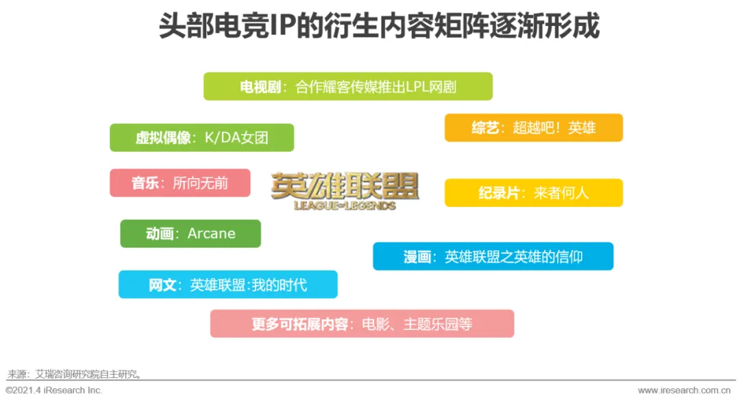 在电竞游戏和电竞赛事之外,头部电竞IP如英雄联盟、王者荣耀等已开始逐渐打造自身的衍生内容宇宙。以英雄联盟为例,在影视剧、综艺、纪录片、虚拟女团、动漫、网文等均已有众多内容的拓展,未来还可能会拓展出电影、主题乐园等,电竞领域的“迪士尼”似乎已见端倪。而在观众的认可度上,电竞衍生内容质量的提升也获得越来越多用户的认可。以2020年新上线的电竞衍生剧《穿越火线》为例,截至2021年4月在豆瓣平台有接近13万人打分,评分达8.1分。