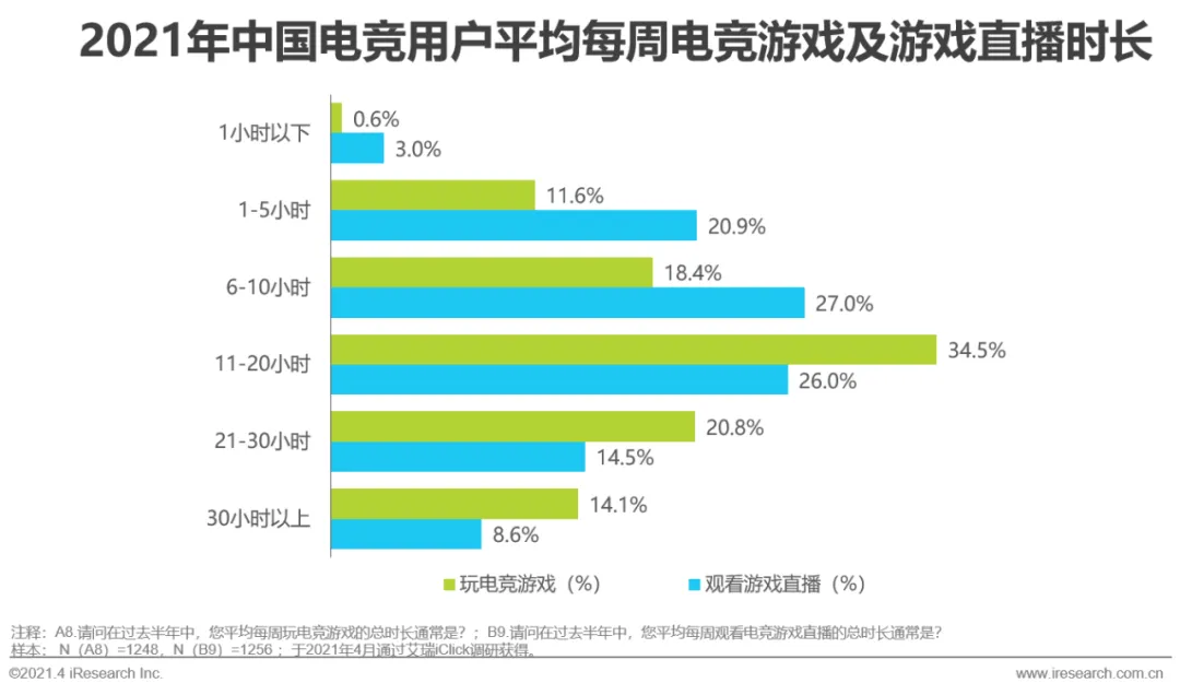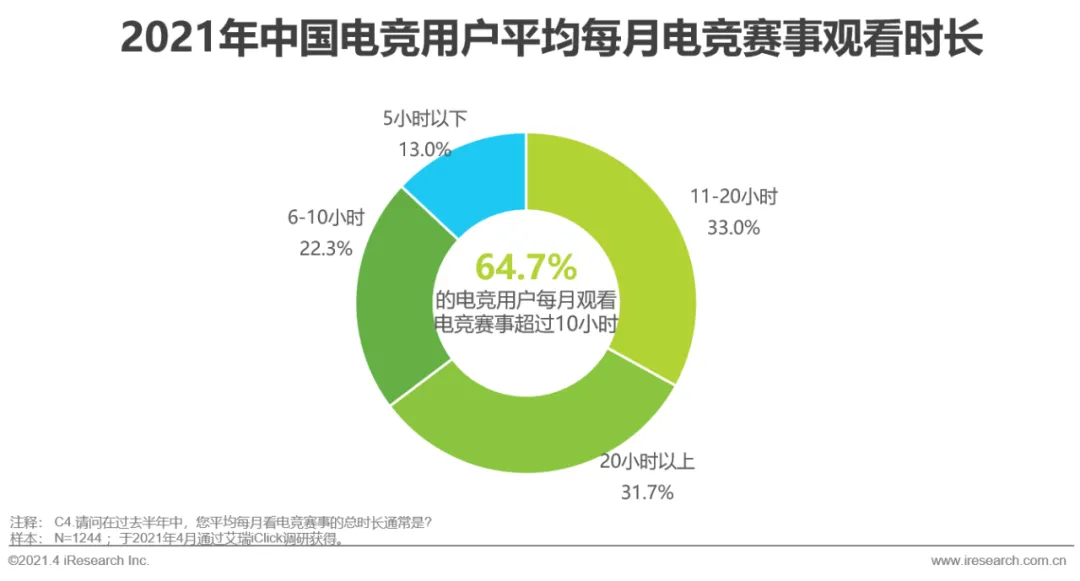 疫情影响下,用户在线娱乐时间的增长,也带动了用户在电竞内容上体验时长的提升。在2021年中国电竞用户中,平均每周玩11-20小时电竞游戏的占比最高,达到34.5%;平均每周观看6-10小时游戏直播的占比最高,达到27.0%。而在电竞赛事的观看上,64.7%的电竞用户平均每月观看超过10小时。