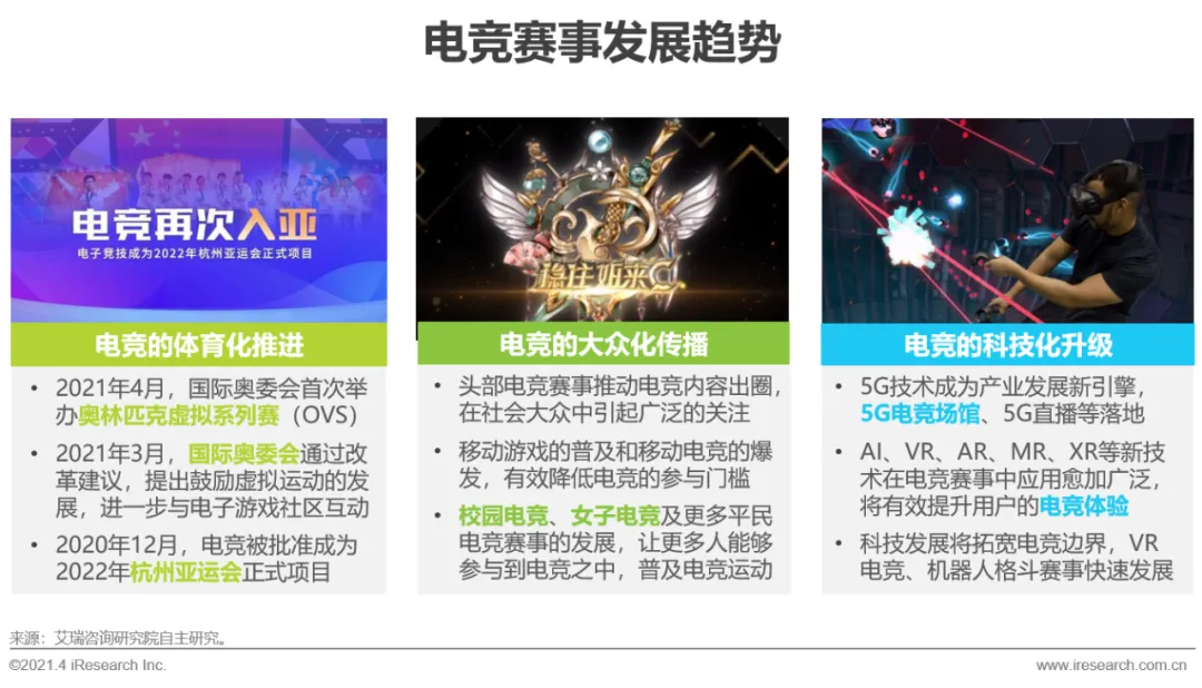 作为数字体育的新模式,一方面,电竞成为亚运会正式项目、国际奥委会持续探讨电竞并合作五个国际体育协会及游戏厂商制作棒球、帆船等奥林匹克虚拟系列赛,都说明着电竞向体育产业的推进和转型升级。另一方面,与传统体育相同,电竞同样要落地大众化,移动电竞的普及、校园电竞和女子电竞的快速成长,都在助力电竞的大众化传播。此外,技术的创新为电竞产业发展提供新的动力,5G、AI、VR、AR、MR等技术与电竞的结合将带来新的契机,在电竞的赛事内容、商业模式、用户体验等方面完成全方位升级。