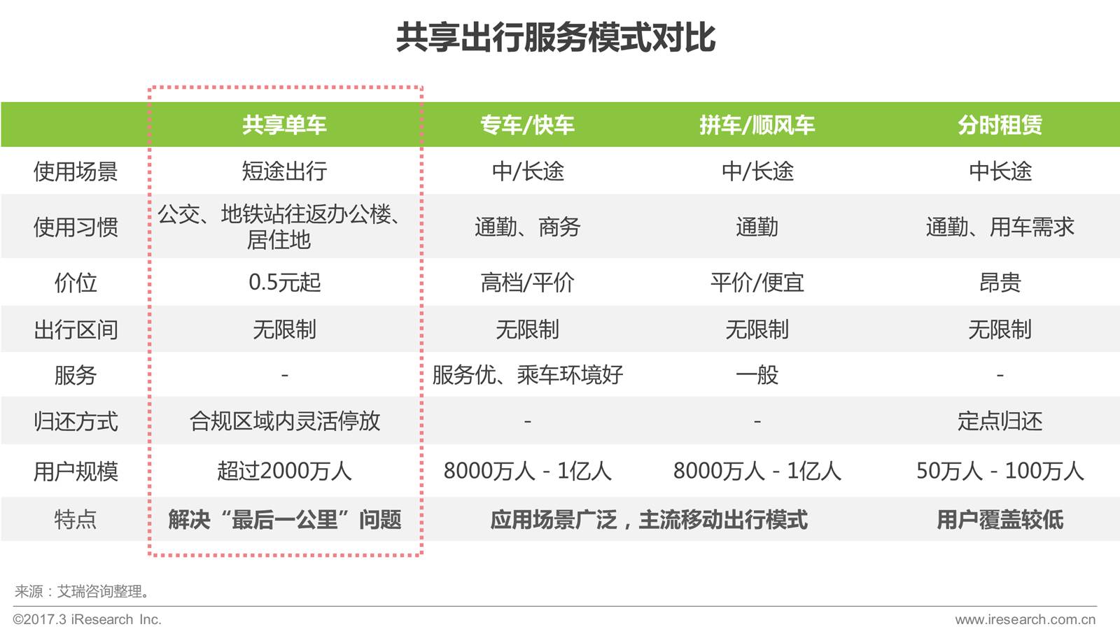 作为在线出行行业的主流服务,共享出行包含专车、快车等网约车服务,分时租赁服务,以及2016年火爆市场的共享单车服务;相比网约车的专/快车及顺风车,共享单车解决了用户“最后一公里”的出行问题,节约用户等车的时间成本及服务的费用成本;相比分时租赁,共享单车使用方便,取还车灵活,使用性价比高,目前共享单车用户覆盖率增长迅速,远超分时租赁用户群体。