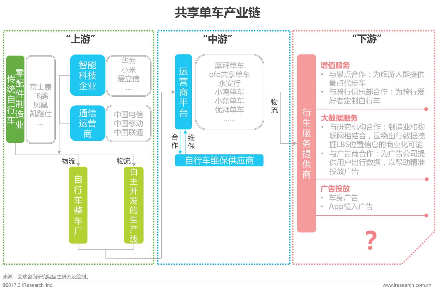 共享单车产业链逐渐成熟,上游供应商是关键,衡量着企业的量产能力和迭代更新速度;物流连接过程中带来的问题以及寻找下游最合适的盈利模式仍需探索;在拓展盈利模式的同时需思考其可行性,例如车身的广告投放会对城市容貌带来影响、与景点/骑行俱乐部的合作会面临用户体量小等类似问题。