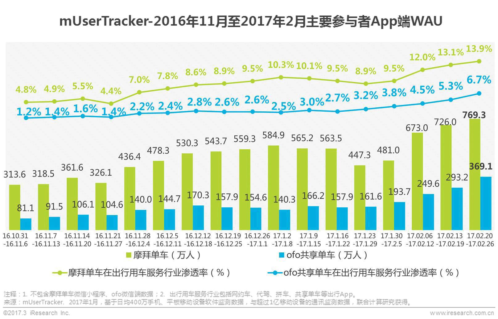2016年11月至2017年2月,摩拜单车活跃用户总体呈上升趋势,由于春节的因素,2017年春节周摩拜单车活跃用户规模受到影响,但在春节后迅速回升,2月末活跃用户规模达到最高值,为769.3万人,相较2016年10月末,增长455.7万人,增长约2.5倍;摩拜单车目前在整体出行用车服务行业中渗透率已达13.9%;同期,ofo共享单车活跃用户整体稳步提升,活跃用户规模最高为369.1万人,相较2016年10月末,增长288.0万人,增长约4.6倍,在整体出行用车服务行业中的渗透率最高达到6.7%。