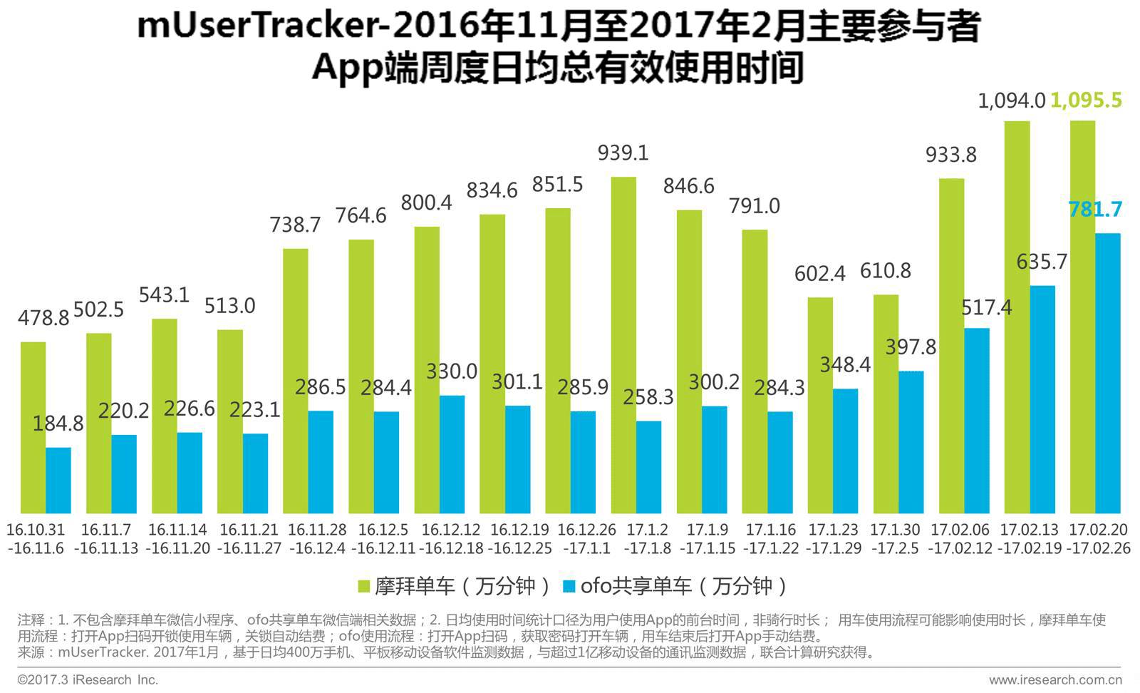 摩拜单车用户活跃时长增幅明显,峰值已超千万分钟