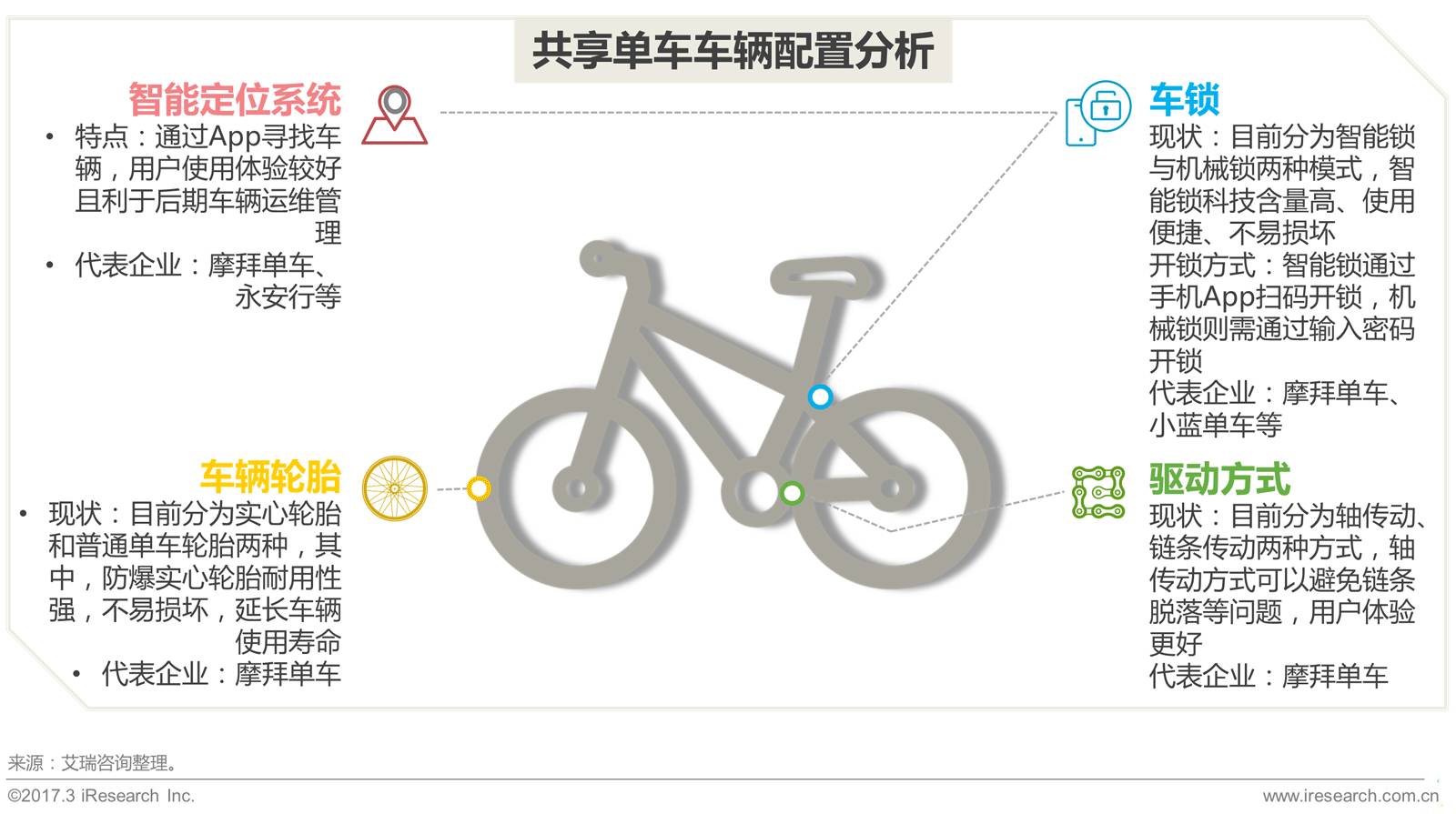 各类单车中,摩拜单车及小蓝单车采用自行设计及生产制造方式,整车科技感较强;