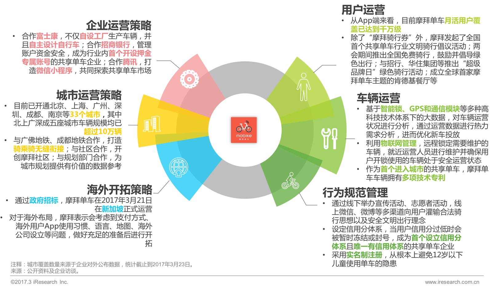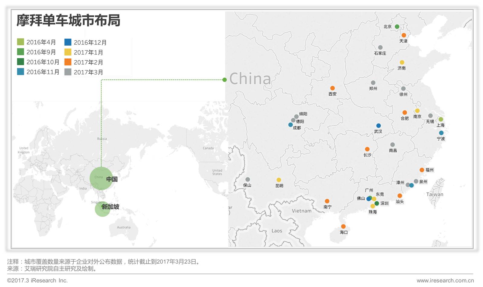 截至2017年3月,摩拜单车已进入33座城市,其中包括2016年进入的北京、上海、广州、深圳、成都、厦门、武汉等,以及2017年新布局的合肥、西安、长沙、福州、新加坡等海内外城市。在新的一年中,摩拜单车将继续引领绿色、环保、智能出行风潮,让自行车回归城市。