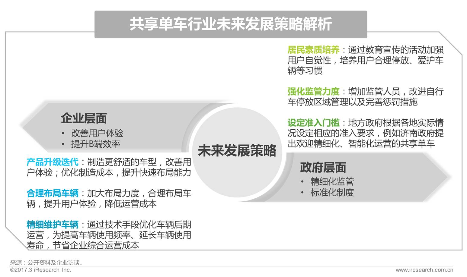 共享单车行业未来将面临市场需求不平衡、城市管理难度大以及用户行为不规范等问题,针对以上问题,企业层面的产品制造升级、智能科技创新能力是为满足消费者需求与提升企业效率的核心竞争力,随着发展,马太效应显著,科技化产品、注重用户体验与城市可持续化发展的企业将占据市场主要地位,因此,企业应加强产品升级迭代速度与质量、合理投放车辆并完善车辆维护措施;而政府层面,应考虑因城施策,要求单车企业建立有效的智能化管理方式,以提升车辆监管与运营效率,彻底改善目前车辆停放、运维、安全等问题。