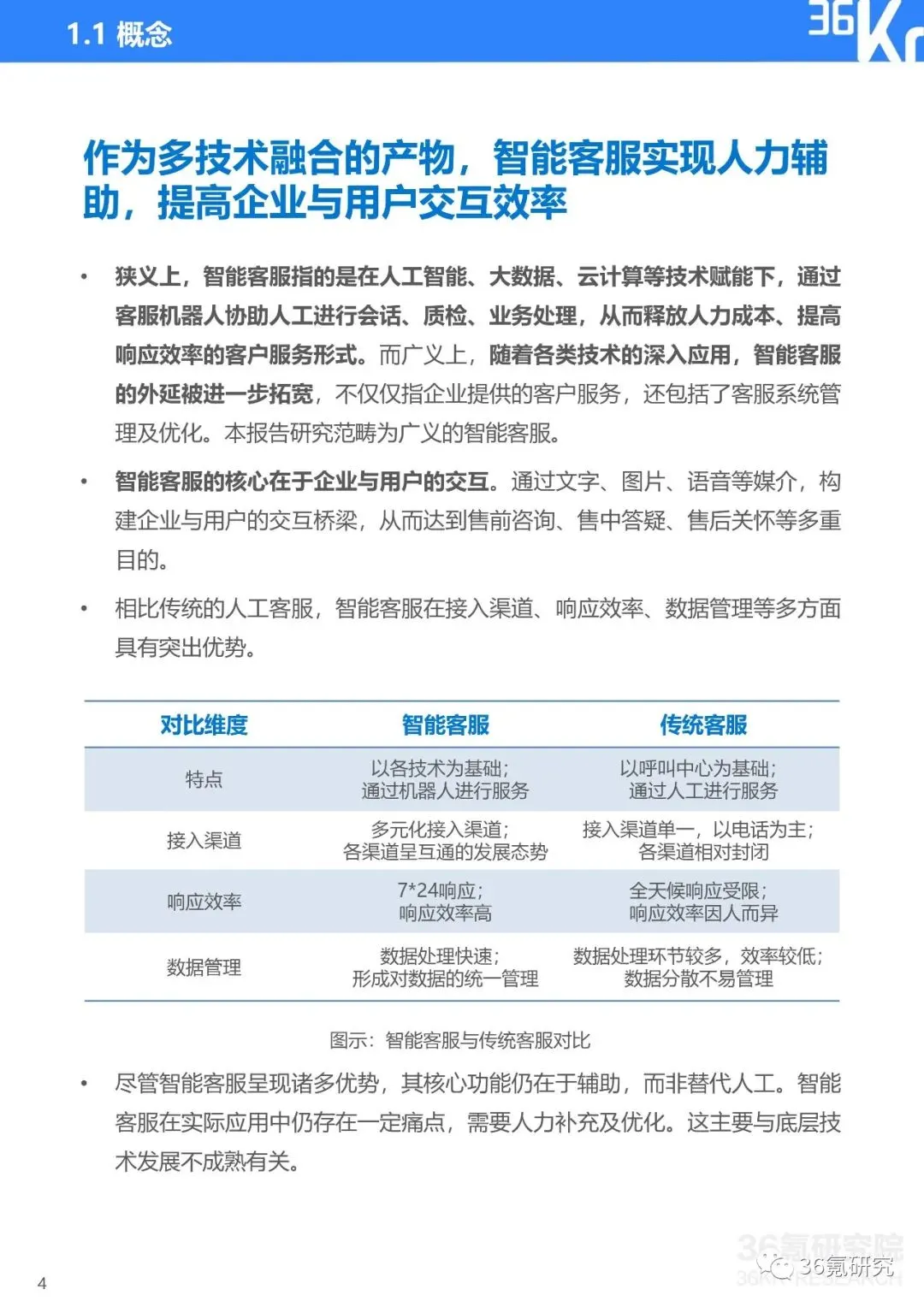 根据36氪研究院的定义,智能客服指的是在人工智能、大数据、云计算等技术赋能下,通过客服机器人协助人工进行会话、质检、业务处理,从而释放人力成本、提高响应效率的客户服务形式。而多技术的深入应用,进一步拓展了智能客服的职能边界,由基础的人工客服辅助向运营管理、营销等功能延伸。