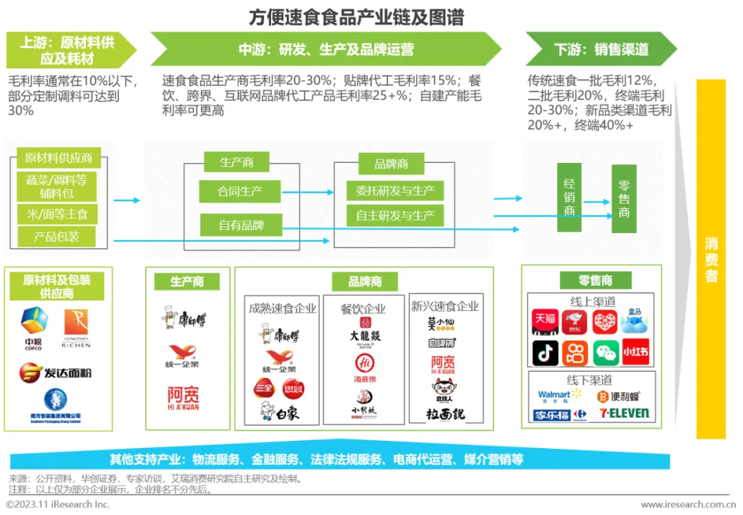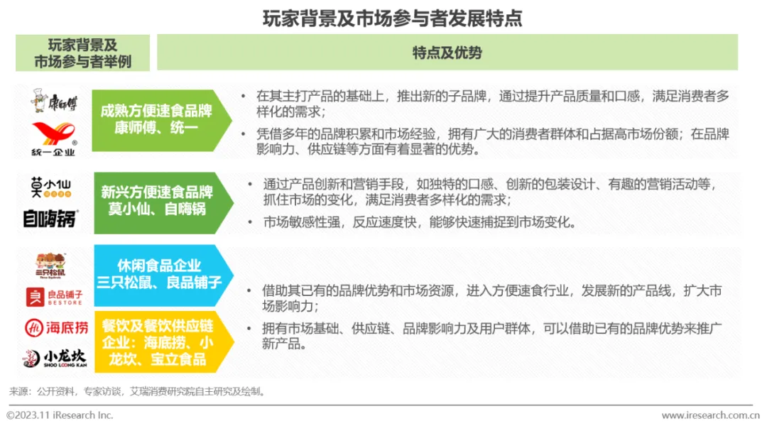 除了成熟和新兴方便速食企业,休闲食品企业、及餐饮品牌/餐饮供应链企业纷纷入局,市场参与者众多,玩家背景多元化