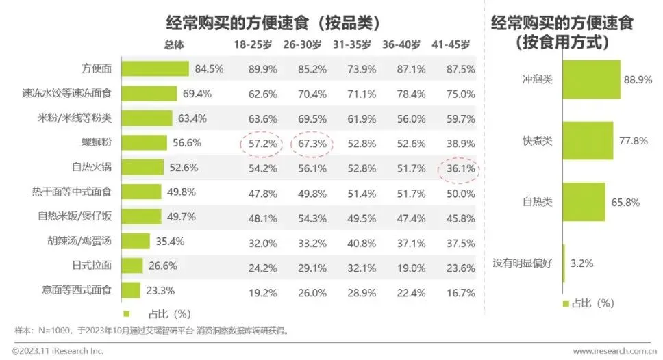 方便面仍是消费者最常购买的速食产品;年轻用户对螺蛳粉、自热火锅等新品类偏好度显著高于中年人
