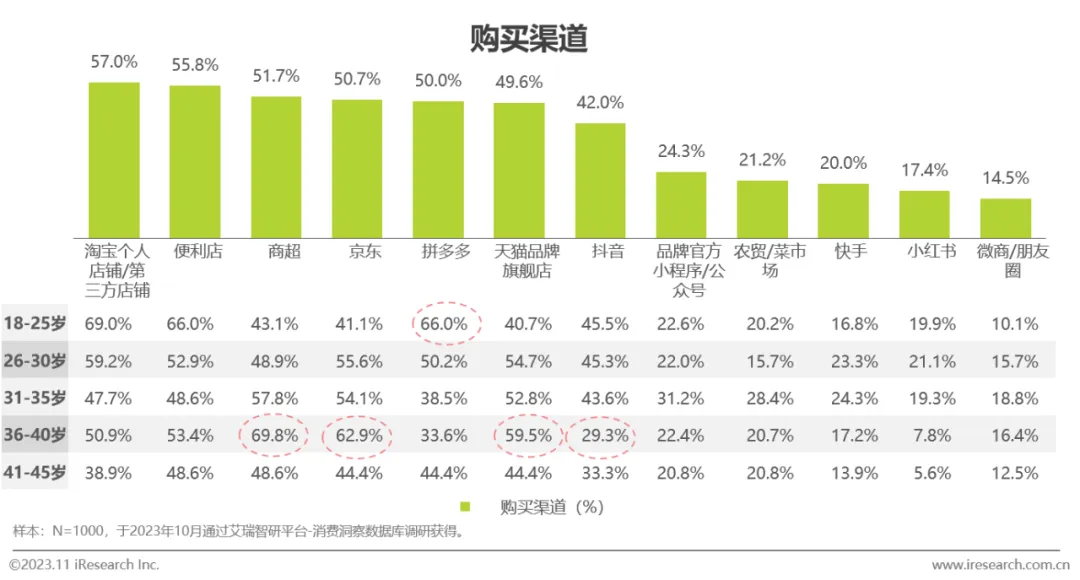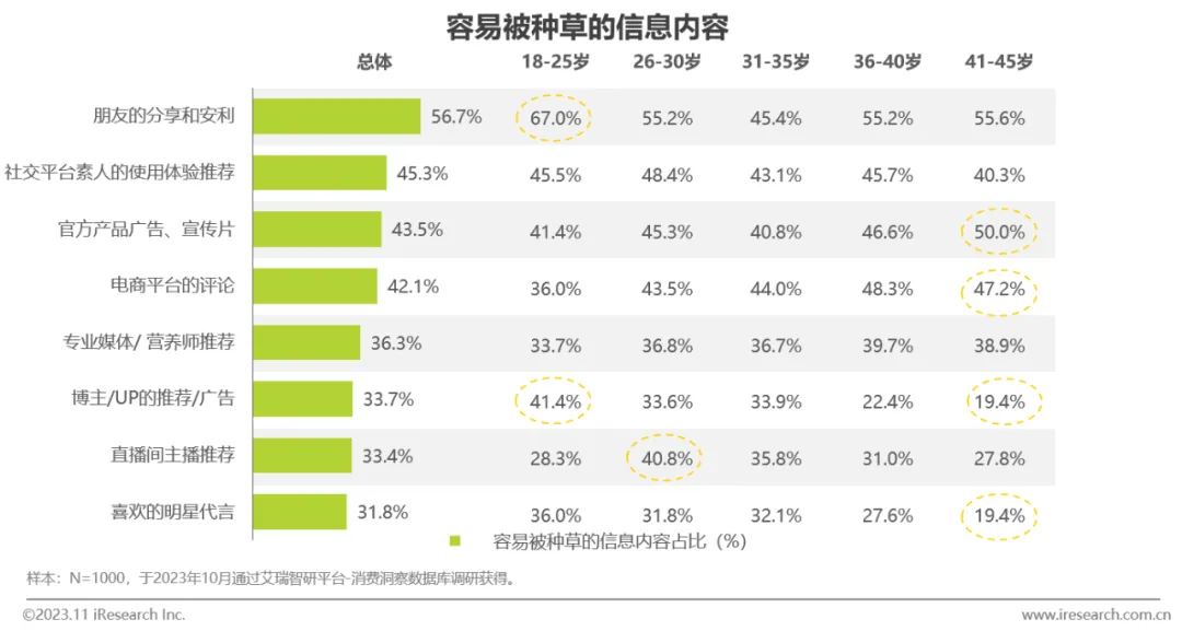 朋友的分享和安利在所有年龄段中最具影响力;年轻消费者更易受新媒体营销的吸引,年长消费者对官方信息及电商平台评论偏好度高
