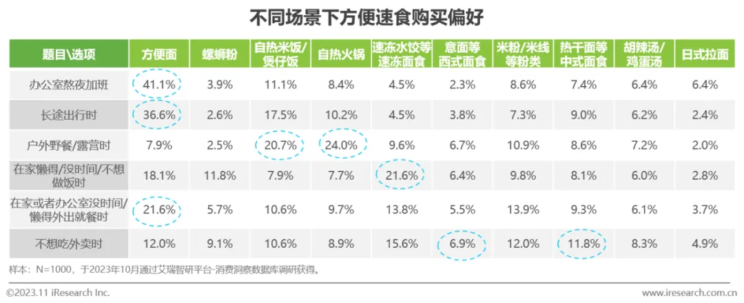 消费者对产品类别的选择主要根据具体需求和场景决定,有明显的场景化特征;方便面在办公室加班及长途出行表现突出,自热类则在户外活动时