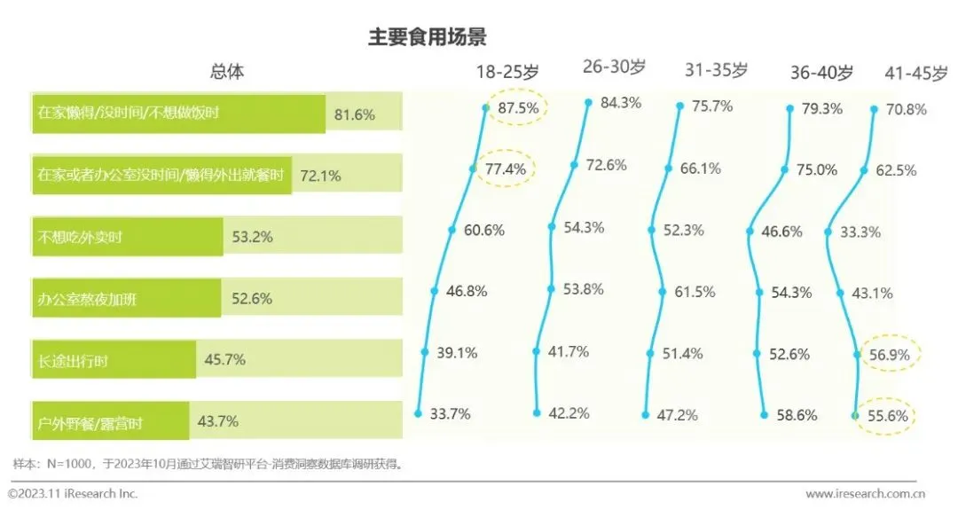 消费者主要在懒得/没时间/不想做饭时(81.6%)和在家或者办公室没时间/懒得外出就餐时(72.1%)食用方便速食,说明消费者主要在需要节省时间的场景下食用,可以看出方便速食的便利性和节省时间的特点是满足消费者需求的关键;长途出行及户外野餐在36岁以上的中年用户中表现显著高于整体水平。