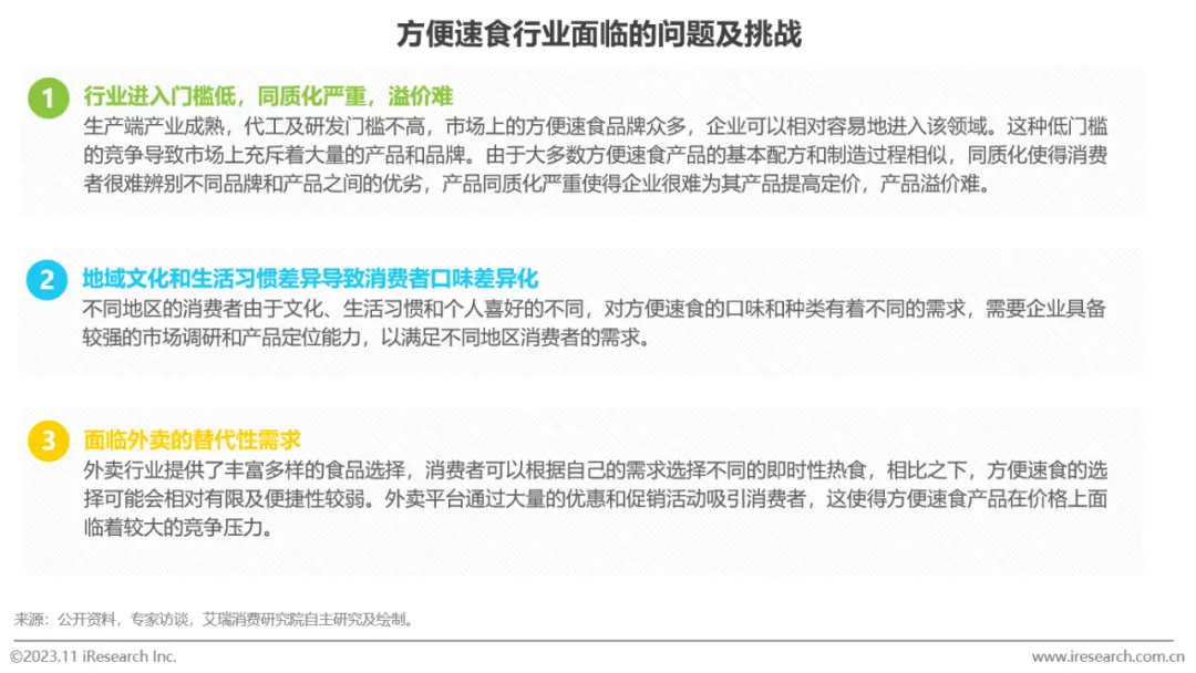 方便速食行业由于低门槛导致市场饱和与同质化,同时需应对各地口味偏好的差异,并面临来自外卖行业多样选择和优惠活动的激烈竞争压力。