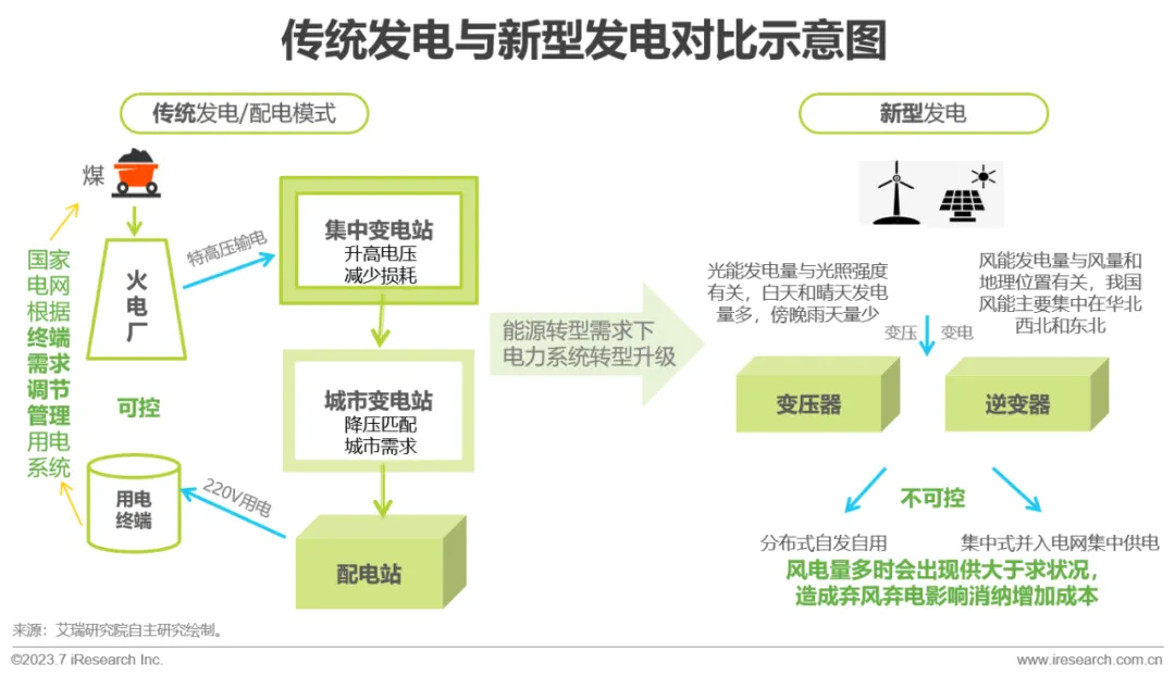 然而传统发电主要为人工填料燃煤,可根据数据分析、节假日及不同季节负荷的特征、天气预报等对未来几日用电情况进行较为准确的预测,同步匹配用电系统,并在运行过程中滚动调节运行。但同样发电厂仅可实现发电不能储电,仍需要调节电力供应以匹配需求端的电力变化,维持电力的供需平衡。相较传统模式,新型电力系统虽有环保、能源储量大等优点,但由于来源主要为太阳能、风能等自然能源,受地理位置、天气环境等影响,有资源波动不稳定等天然缺陷,较难24小时控制以实现供需平衡。