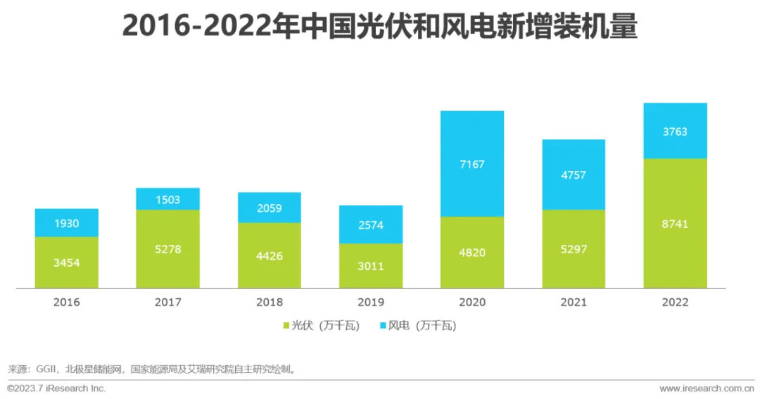 新型发电形式在电力市场装机量中占比不断增加,2022年我国风电、光伏发电量达到1.19万亿千瓦时,较2021年增加2073亿千瓦时,同比增长21%,占全社会用电量的13.8%,同比提高2个百分点,接近全国城乡居民生活用电量。同时电力基础设备的老旧化已无法适应新型电力系统更综合且庞大的电力结构。在风光发电模式的逐渐成熟化下,为提升整体电力系统可靠性,协调资源灵活使用、稳定消纳,市场开始逐步催生配储需求。
