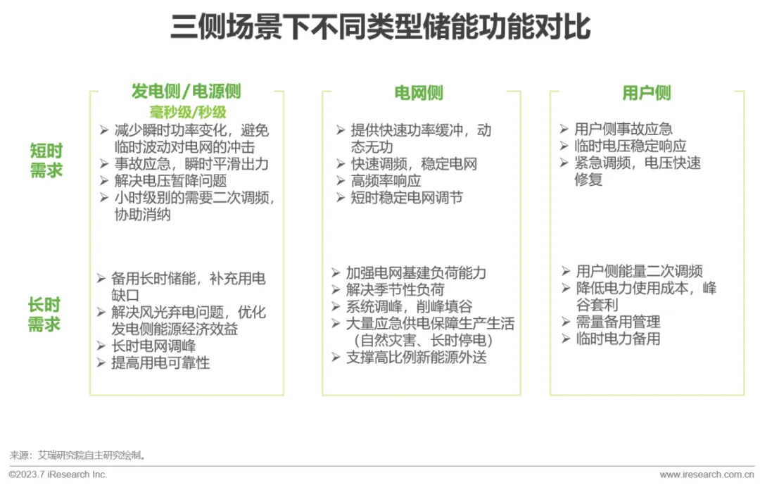 从电网角度来看,发电侧、电网侧和用户侧在不同时间维度下都存在不同痛点,以对应不同配储的需求,从而实现电力系统长效、高经济型发展。