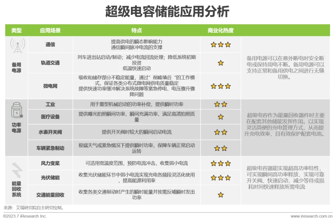 超级电容的电学特性决定了其直接做功的瞬时补偿特征突出,并且功率损耗较低。在一些极端理想场景下,对于基于安全性考虑的响应效率和基于功率要求的超高功率特征,决定了其在重要的工业、基础设施(通信、轨道交通等)均具备很理想的适用性。同时,如果能匹配其他的储能方式,实现高功低释的电能转化,其场景应用将会更加灵活广泛。