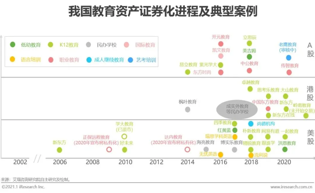 我国教育资产证券化历程可大体分三个阶段:第一阶段,2010年至今的美股上市潮。2006年新东方美股上市开启了我国教育公司赴美上市先河,2010年,以好未来、学大教育为代表,掀起我国教育公司赴美上市热潮;第二阶段,2014年至今的A股并购潮。教育资产因权属不清、财务核查困难等问题很难在A股证券化,2013年从上海开始,政策趋势向好,但仍很难在A股IPO,很多教育资产通过被并购实现证券化;第三阶段,2017年至今的港股上市潮。2014年开始,陆续有民办学校赴港上市,并在2017年后迎来高峰期。2018年,以卓越教育为代表,又陆续有K12培训机构赴港上市。近两年,随在线教育行业商业模式逐渐走向成熟,进入到证券化阶段,在线教育公司开始密集赴美上市,如跟谁学、网易有道等。而在A股,随民促法获通过、A股市场化改革不断推进,出现了首例职业教育公司IPO上市案例,教育资产证券化将迎来新的发展阶段。