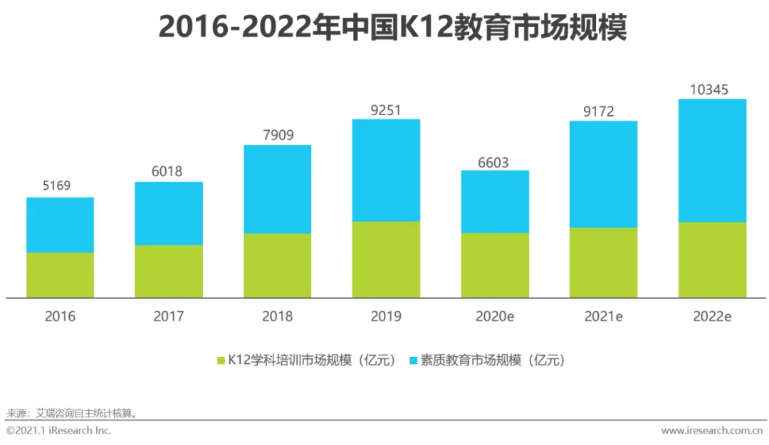 据艾瑞咨询统计核算,2020年中国在线教育行业市场规模2573亿元,过去4年的CAGR达34.5%,其中低幼及素质教育赛道、K12学科培训赛道在线化进程加快是在线教育市场快速增长的最主要贡献因素。疫情影响下,低幼及素质教育领域的在线化范围持续纵深,职业教育领域的在线化进程也在不断加速,新的供给和需求不断产生。但同时,2020年疫情外生冲击加快了2020年的在线教育进程,将会透支一部分2021年的增速,艾瑞预计2021年在线教育行业同比增速将回落到20%左右。