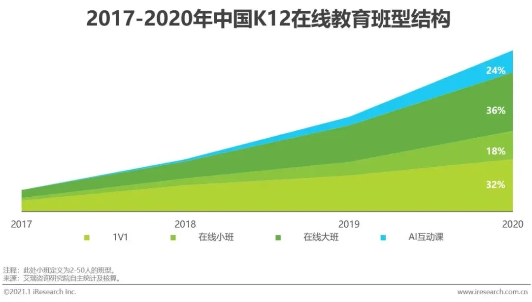 据艾瑞咨询统计核算,在线1V1和在线大班是目前K12在线教育中规模最大的两类班型,2020年的市场份额分别为32%和36%。在线小班目前规模相对较小,2020年市场份额18%左右。而AI互动课作为新物种,近两年快速发展起来,在低幼启蒙教育和在线编程教育中快速占领市场。