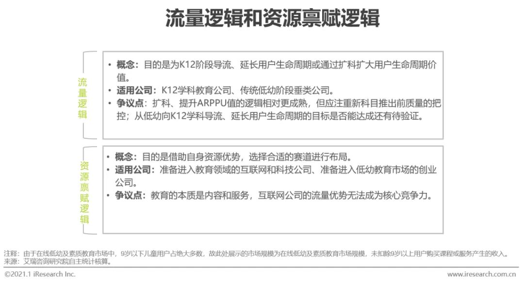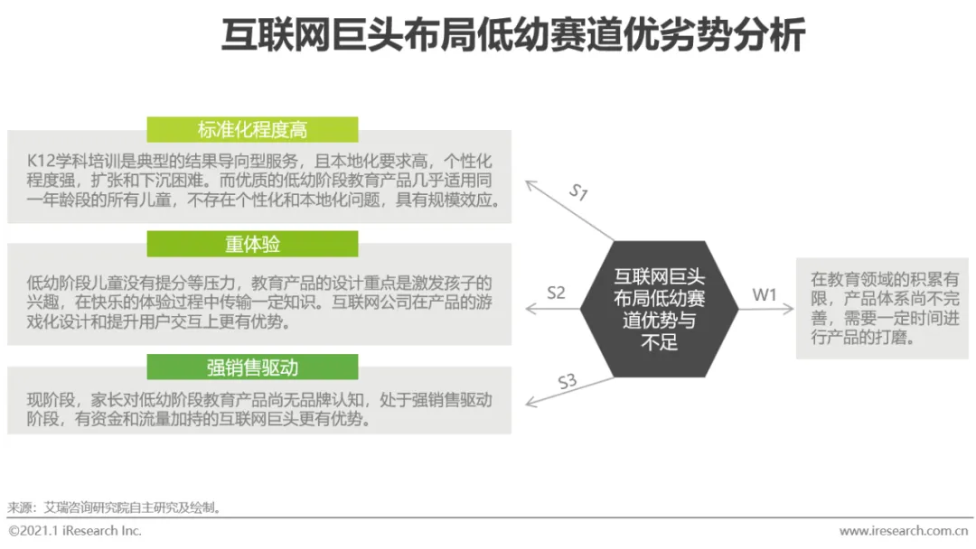 相对而言,低幼教育产品具有标准化程度高、重体验、强销售驱动的特征,艾瑞认为,相较于K12学科培训等品类,互联网的流量资源在低幼领域更易彰显价值,互联网巨头的入局造成的冲击会更大。