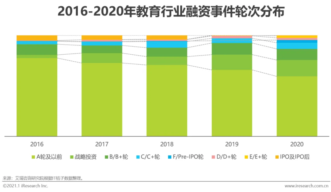 教育行业短期靠营销,长期靠优秀的产品体验和效果来建立差异化的竞争优势。现阶段,在线教育行业整体仍处于营销驱动阶段,头部玩家纷纷大额融资备足粮草,准备新一轮的跑马圈地。资本市场更加奖励头部企业,融资轮次向后迁移,融资金额向头部企业倾斜。从融资情况看,2021年在线教育企业间的竞争会更加的残酷和激烈,腰部和尾部的小企业面临着较大的生存压力。
