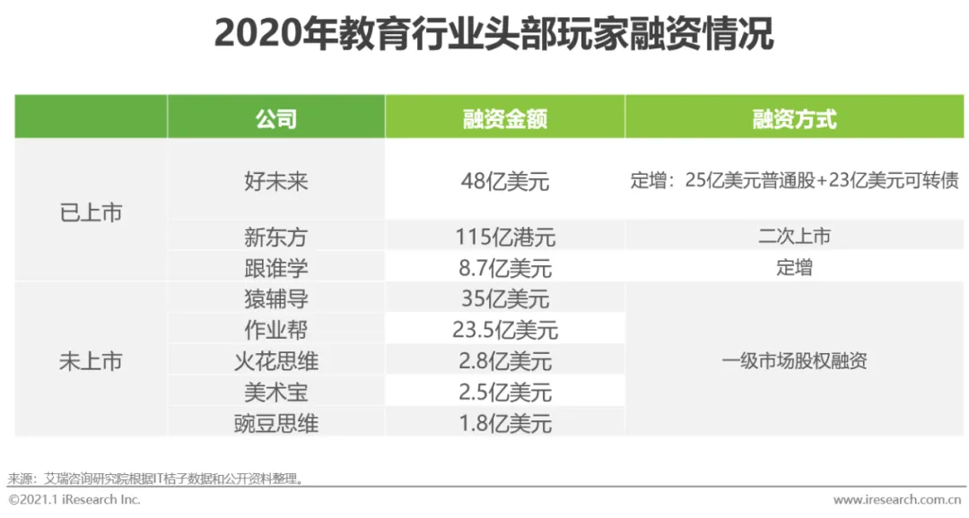 《从0到1》中写到,“还没有哪个产业能重要到只要参与其中就能建立卓越的企业”,火热的在线教育赛道亦是如此,行业的利好正越来越成为对头部企业的利好。反映到投融资市场,一个明显的现状就是头部企业估值更高、议价能力和吸金能力也更强。2020年在线教育企业融资总额1034亿元,其中融资金额最高的5家公司融资总额达827亿元,占比80%,其中好未来和猿辅导2020年融资金额分别达333亿元(48亿美元)和243亿元(35亿美元)。