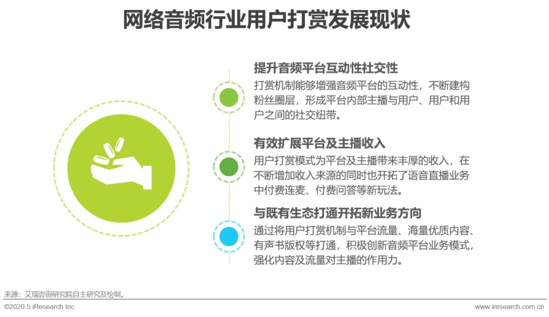 音频平台的用户打赏机制主要建立在平台语音直播业务模式的基础上,通过打造平台内部主播与用户、用户和用户之间的社交纽带,增强整个音频平台的互动性,从而有效提升平台用户粘性。用户打赏模式的不断发展丰富了平台及主播的收入来源,也提高了整体收入水平,用户打赏机制同时也带动了语音直播业务促生新玩法,付费连麦、付费问答成为新的收入方式。此外,通过将用户打赏机制与平台流量、海量优质内容、有声书版权等打通,积极创新音频平台业务模式,强化内容及流量对主播的作用力。