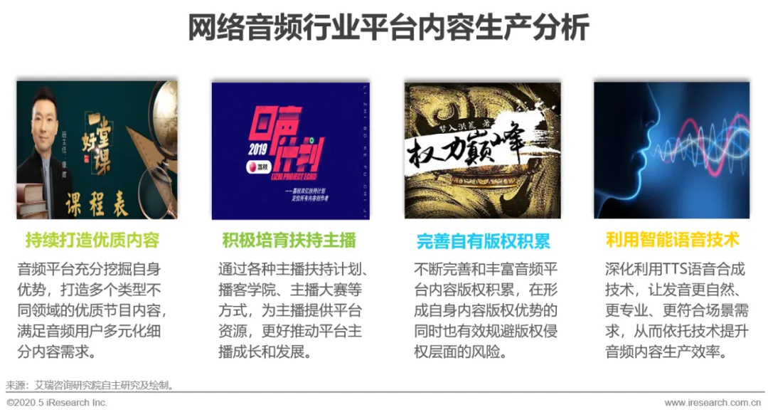 网络音频核心竞争力体现在内容层面的竞争,因而围绕平台内容进行护城河的有效建构是不断提升音频平台竞争力的重中之重。从目前发展来看,音频平台不断发力打造自有优质内容生产,充分挖掘自身优势,打造多个类型不同领域的优质节目内容,满足音频用户多元化的细分内容需求。在主播培育层面,通过各种主播扶持计划、播客学院、主播大赛等方式,为主播提供平台资源,更好地推动平台主播的成长和发展。此外,音频平台不断完善和丰富音频平台的内容版权积累,在形成自身内容版权优势的同时也能有效规避版权侵权层面的风险。从技术层面来看,充分利用TTS语音合成技术,不断优化语音合成的自然性和个性化,从而为整个音频内容的生产有效赋能。