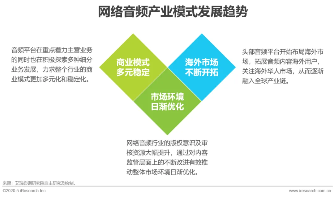 经过多年的发展,音频平台在重点着力自身主营业务的同时也在积极探索多种细分业务发展,力求整个音频行业的商业模式更加多元化和稳定化,从而形成更具规模的产业分布。从整个行业市场环境建构来看,网络音频行业的版权意识及团队审核资源大幅提升,通过对内容监管层面上的不断改进有效推动整体市场环境日渐优化,行业深入规范化发展。此外,头部音频平台开始布局海外市场,拓展音频内容海外用户,关注海外华人市场,从而逐渐融入全球产业链。